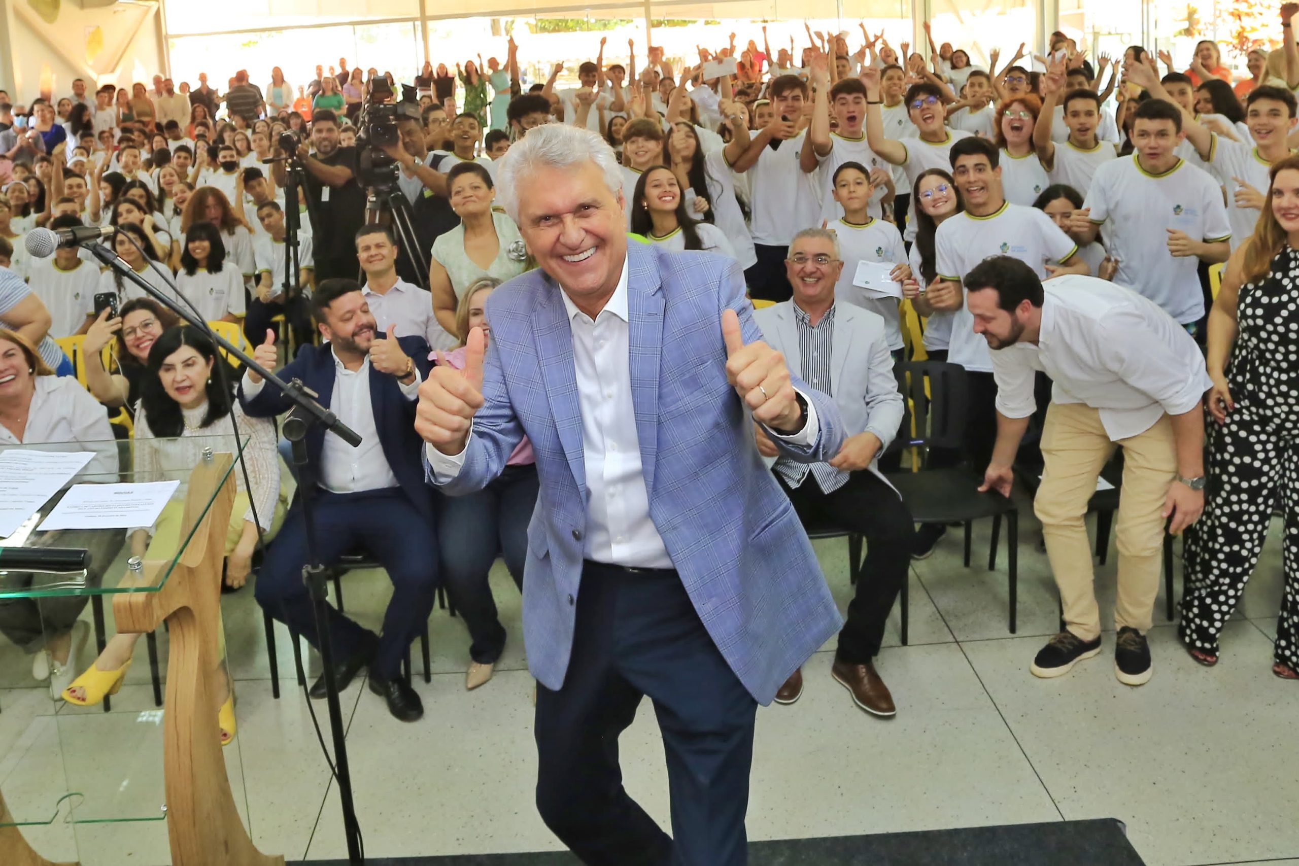 Legenda: Governador Ronaldo Caiado visita novas instalações da Seduc e entrega cartões a estudantes da rede estadual de educação