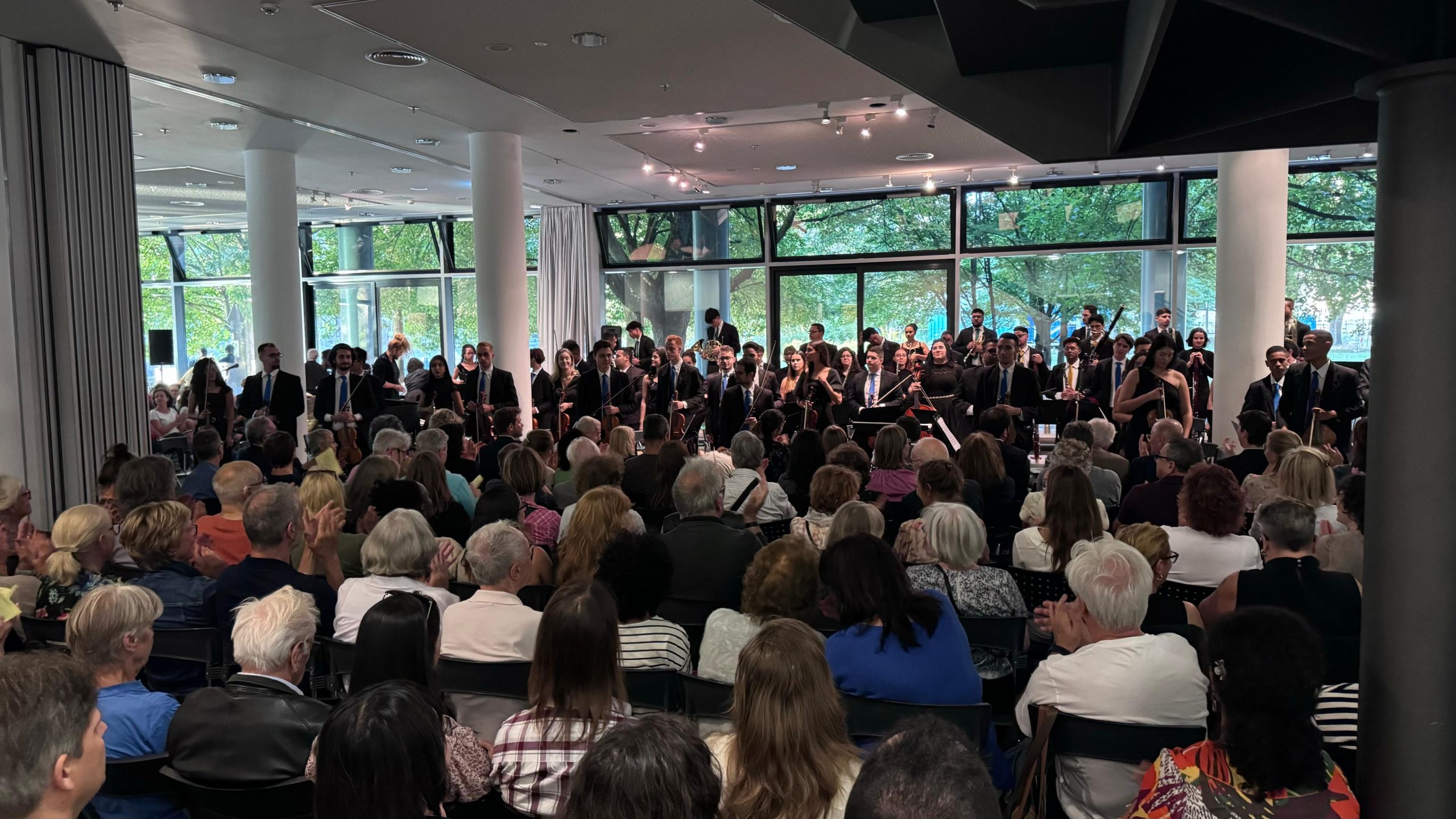 O embaixador no país, Roberto Jaguaribe (ao centro), destacou o apoio do estado durante o primeiro concerto da Orquestra Sinfônica Jovem, realizado em Berlim; apresentação marca o início de uma turnê de dez concertos por quatro países