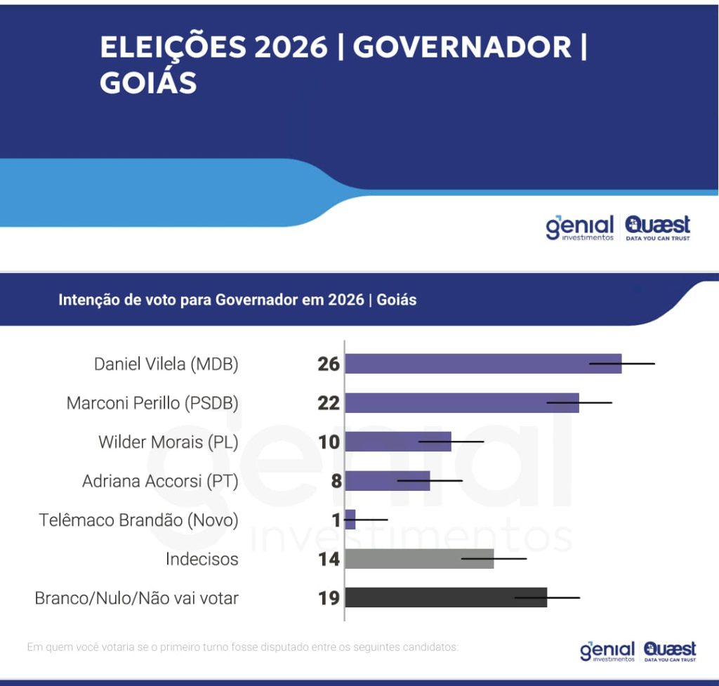 Vilela tem 26%, liderando Marconi, 22%, e a pesquisa também indicou Wilder com 10% e Adriana Accorsi, 8%