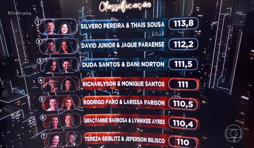 Tereza Seiblitz e Jeferson Belisco também brilharam ao som de “Me chama que eu vou”, música em que a atriz foi protagonista do clipe original nos anos 1990. Já o ex-jogador Richarlyson e Monique Santos levantaram a plateia com “Adocica”, sendo chamados de “rei do rebolado” por Milton Cunha e recebendo nota máxima.