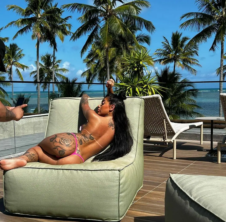 Na foto, a Ex-Fazenda aparece deitada de lado em uma poltrona, usando calcinha fio-dental e fazendo uma pose sexy. Exibindo o bumbum tatuado, MC Mirella atraiu a atenção. No momento do ensaio, a artista não usava a parte de cima do biquíni, fazendo um topless que fez os internautas irem à loucura.
