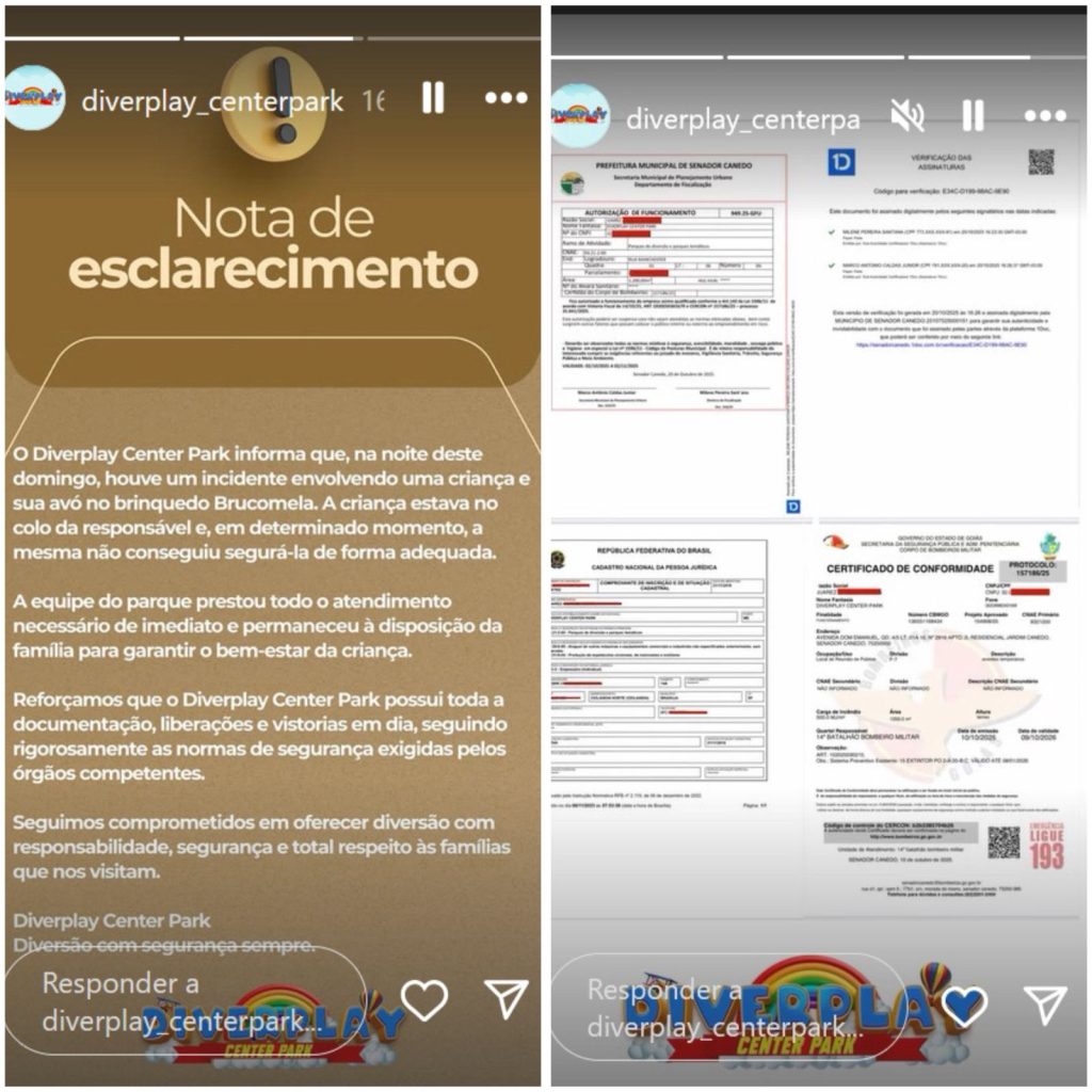Em uma nota publicada nas redes sociais, o parque informou que a criança estava no colo da avó no momento do acidente e que “não conseguiu segurá-la de forma adequada” durante o trajeto do brinquedo.
