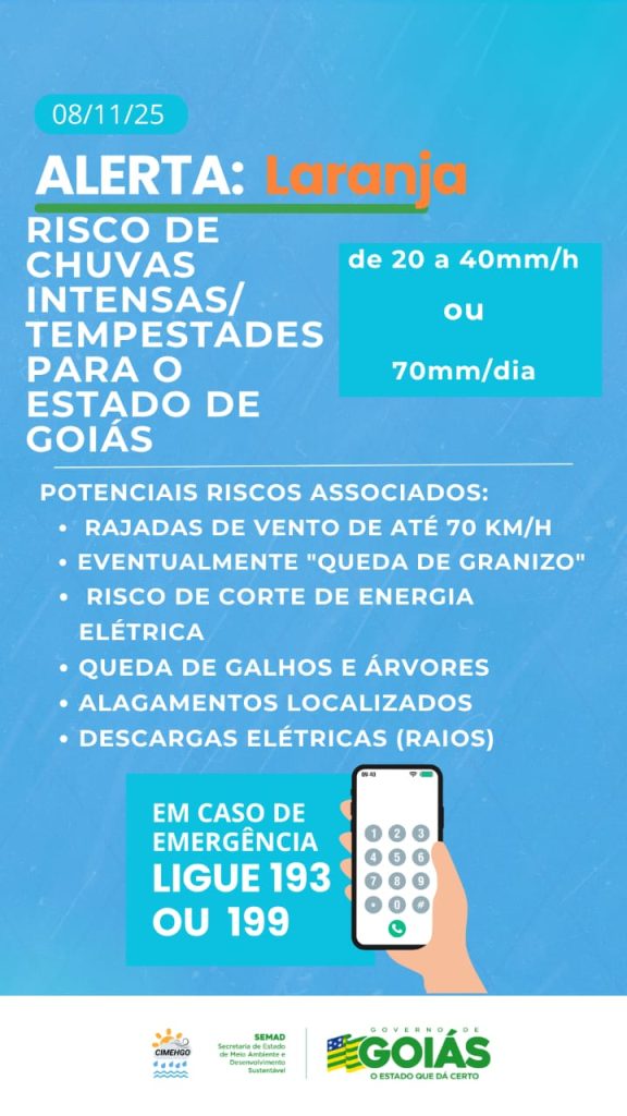 O Centro de Informações Meteorológicas e Hidrológicas de Goiás (Cimehgo) emitiu um alerta laranja para o estado devido à previsão de tempestades severas neste sábado (8). A combinação de calor, umidade e avanço de instabilidades atmosféricas eleva o risco de chuvas intensas, rajadas de vento e queda de granizo.