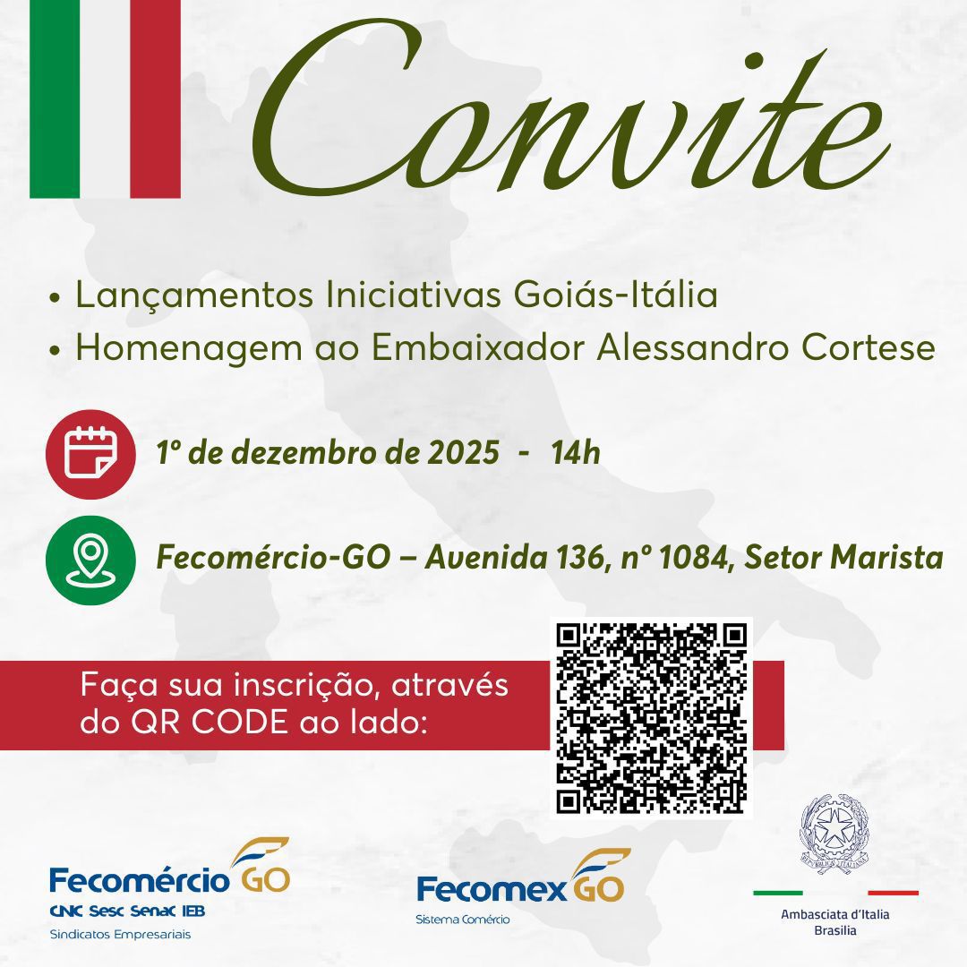 Evento na Fecomércio-GO, em 1º de dezembro, marca o anúncio de curso de italiano no Senac Idiomas, festival gastronômico e missão empresarial, além de homenagear o diplomata