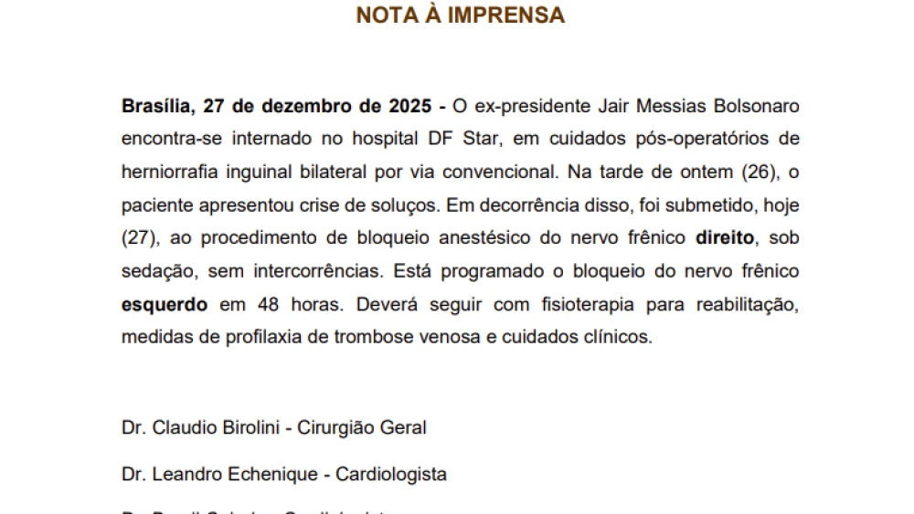 No sábado, Bolsonaro foi submetido a um bloqueio anestésico do nervo frênico, realizado após os médicos avaliarem que o tratamento medicamentoso não apresentou a resposta esperada. A técnica é indicada para casos em que os soluços se mantêm por longos períodos e causam prejuízo à recuperação clínica.
