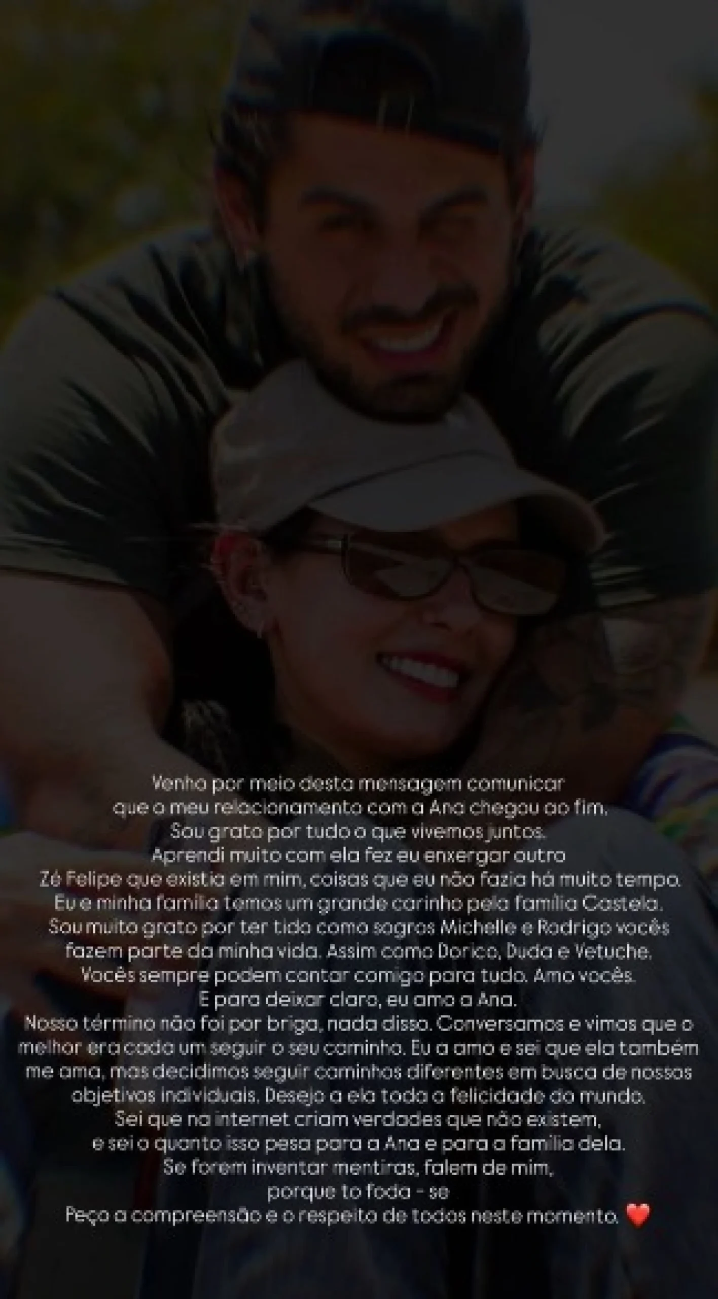 Na mensagem, Zé Felipe abriu o coração ao falar sobre o impacto positivo da relação em sua vida. “Venho por meio desta mensagem comunicar que o meu relacionamento com a Ana chegou ao fim. Sou grato por tudo o que vivemos juntos. Aprendi muito com ela fez eu enxergar outro”, escreveu o sertanejo.