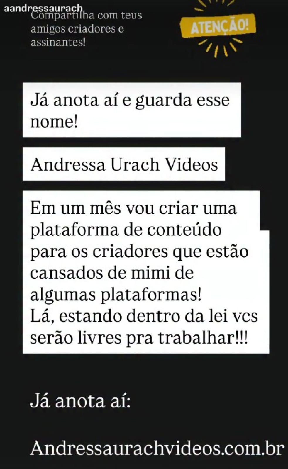 Em publicações nos stories, Andressa afirmou que o projeto pretende atender criadores que se sentem limitados por políticas de moderação de plataformas tradicionais. O nome escolhido, segundo ela, já está definido e o lançamento deve ocorrer nas próximas semanas.