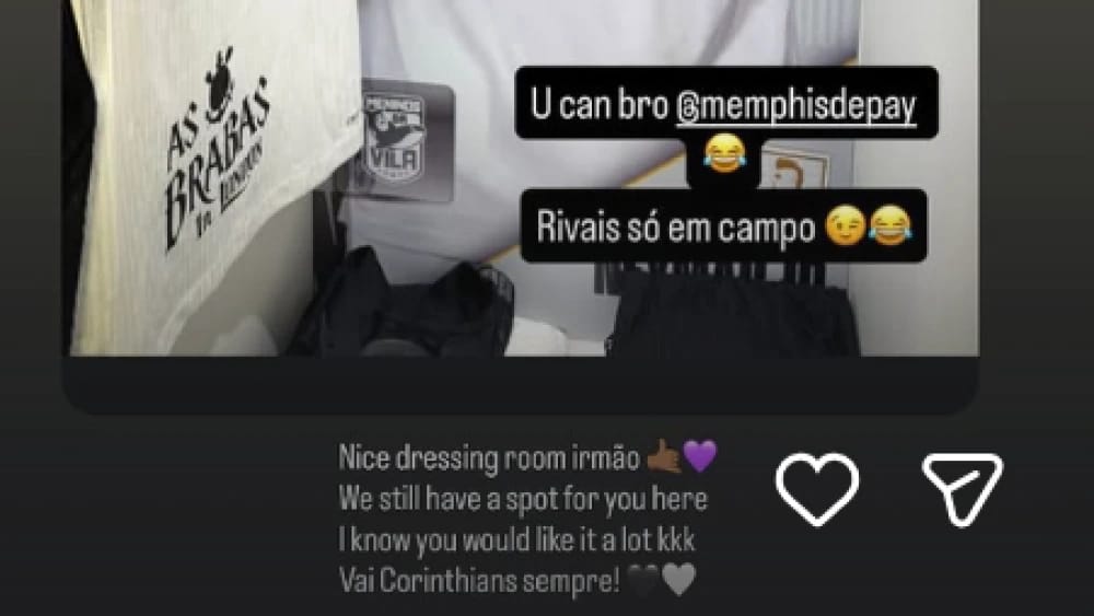 Memphis não deixou a brincadeira passar e repostou a imagem, respondendo de forma bem-humorada. “Bom vestiário, irmão. Ainda temos um espaço para você aqui. Sei que você iria gostar bastante (risos). Vai Corinthians sempre!”, escreveu o jogador do Timão, arrancando reações dos torcedores.