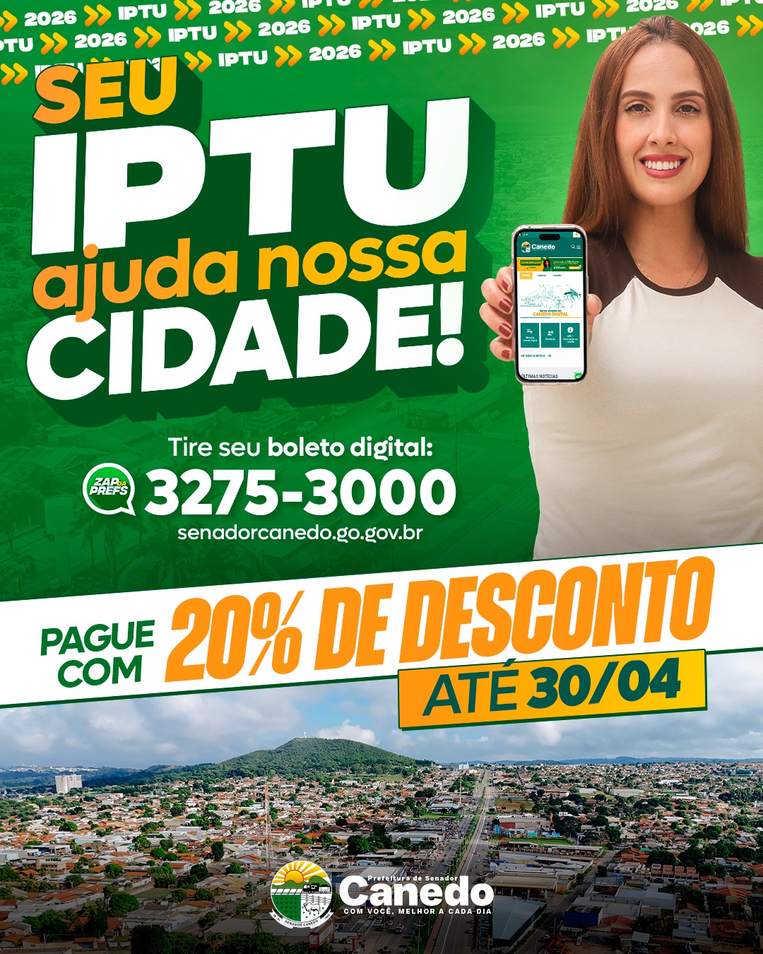 A Prefeitura de Senador Canedo abriu o período de pagamento do IPTU e ITU 2026. Os contribuintes que optarem pelo pagamento à vista terão 20% de desconto, enquanto quem preferir poderá parcelar o imposto em até seis vezes. O prazo para garantir o benefício vai até 30 de abril.