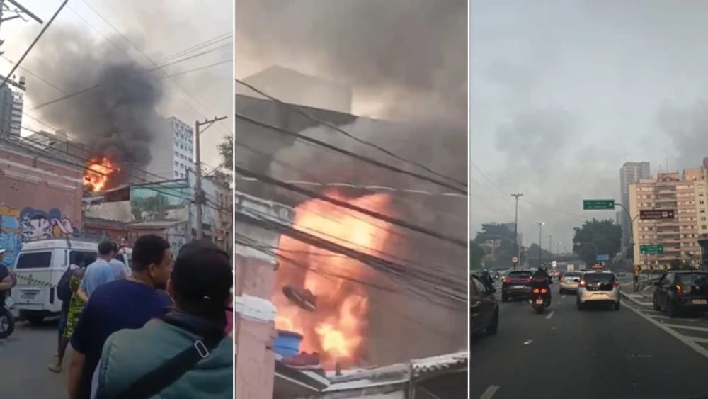 Bombeiros atuam há mais de 14 horas em incêndio em depósito de recicláveis no Centro de São Paulo